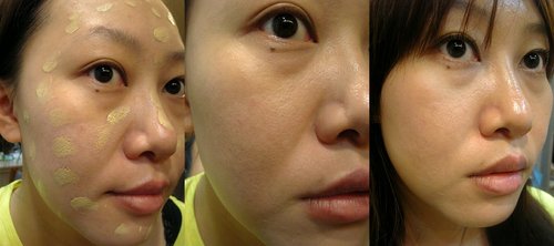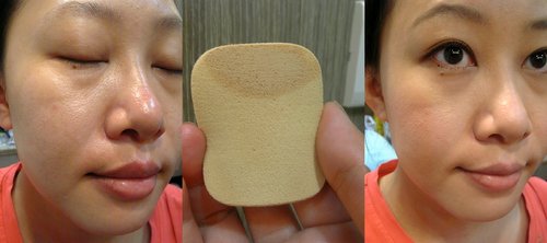 粉底液的遮瑕力比粉餅更好, 下圖左~右分別為: 粉底液>粉底液+粉餅>持妝12HR後妝效