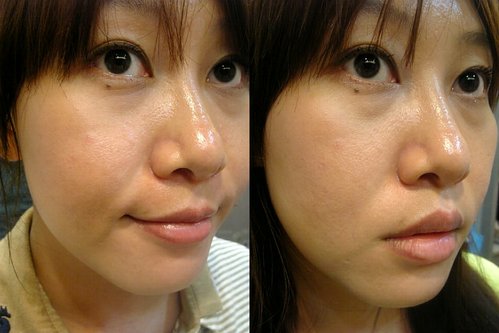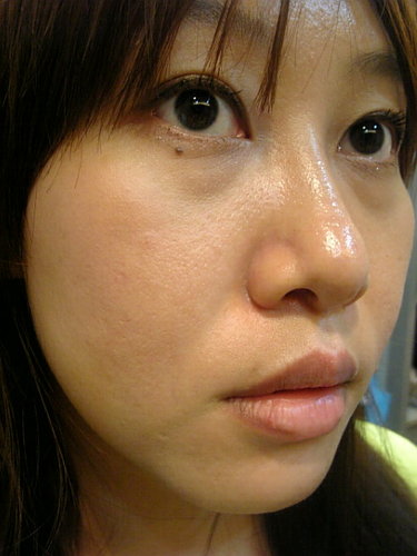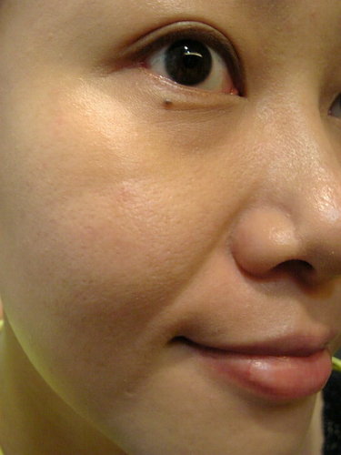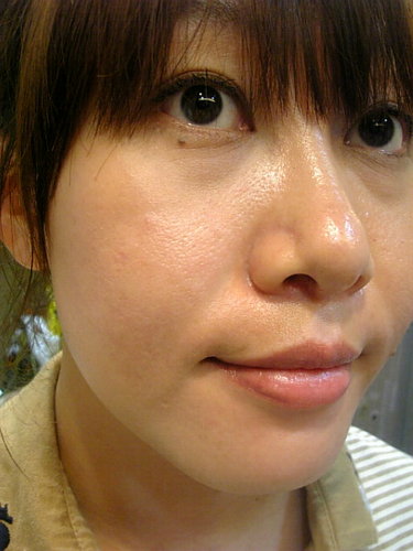 我是覺得有稍微的撫平一些比較淺的毛孔(鼻翼兩側的小毛孔), 太深的或者太大的毛孔(臉頰兩側)還是沒有辦法真正的達到隱形! 相對的, 因為有填補毛孔的問題, 所以卸妝要更加注意, 免的粉刺大軍突襲! 下面兩張圖分別可以看到, 臉頰的毛孔還是很明顯, 但是鼻翼附近的毛孔就比較不明顯了!