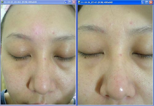 左圖: 眉間清完郵包後 右圖: 隔天起床