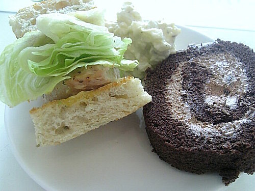 桌上除了好用的保養品外, 還有自由取用的輕食點心~ 我拿了一份三明治(佛卡夏麵包外皮超好吃) + 巧克力捲心蛋糕(超甜) + 馬鈴薯沙拉(有義式香料喔)