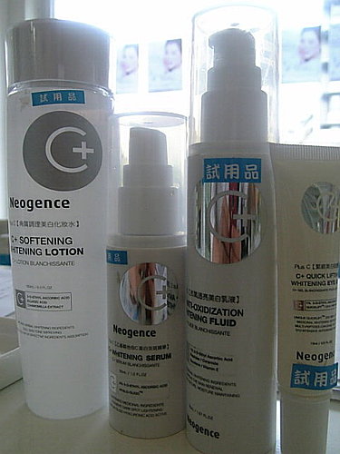從左~右分別是 Plus C角質調理美白化妝水>乙基維他命C美白淡斑精華>Plus C抗氧化透亮美白乳液>Plus C緊緻美白眼教