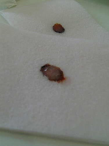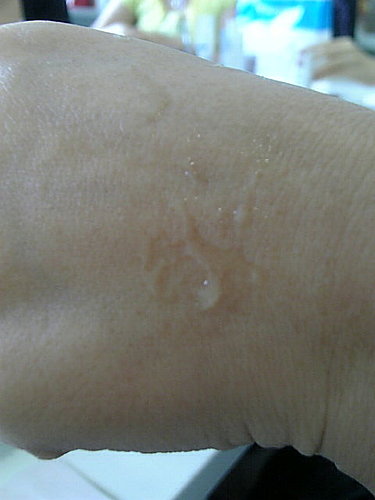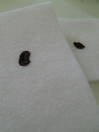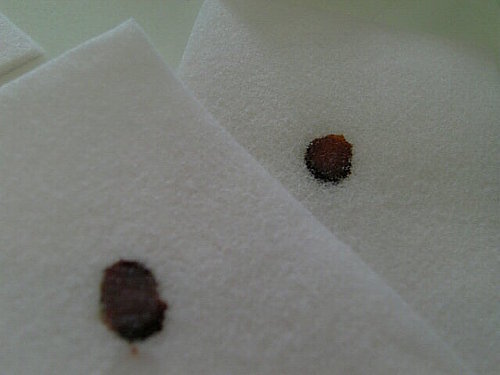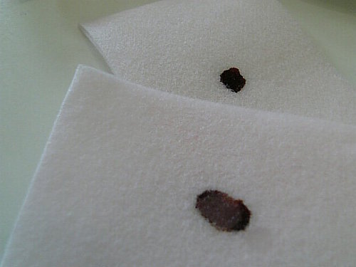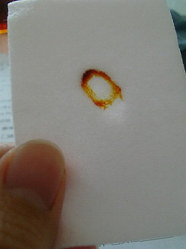我們滴了一小滴在有碘酒的化妝棉上, 幾乎是馬上就可以看到反映了~ (別說沒看到啊!)