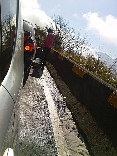 這張圖想表示的是, 後面的車子再加掛雪鏈!!! 而我們正準備下山!!! 味蝦密勒? 因為我們沒有雪鏈.... 再加上租用的費用很高 (租用1500, 買斷2500), 我們不想花這些錢上山看殘雪 (據花錢上山的人說, 上山後沒有下雪, 只是地上的雪比較厚而已).