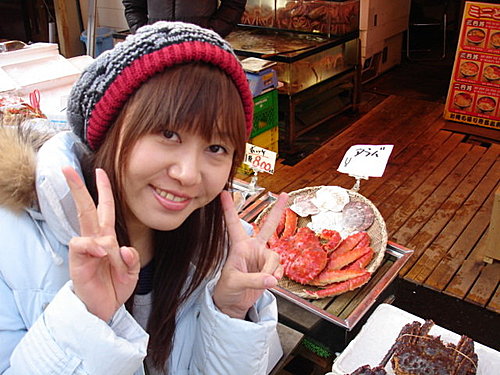 在北海道的每一天都是跟螃蟹為伍~ (上圖為函館朝市) 在這條街上我們家花了不少日幣. 買了干貝/昆布/魷魚絲