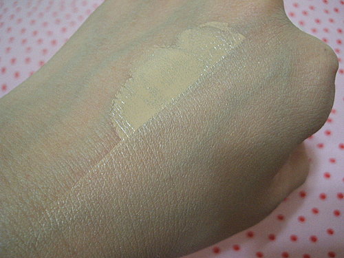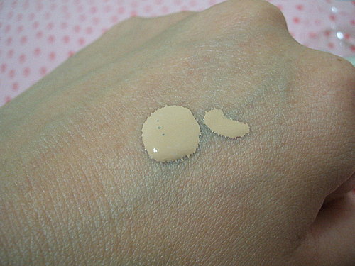 我先用手把粉底液和開, 用海綿粉撲擦了半隻手, 遮瑕力很不賴, 原本肌膚的色調都有被改掉, 而且也不會有厚重的粉感, 粉底液還帶有一點點的亮片, 擦在臉上還會有beling beling感.